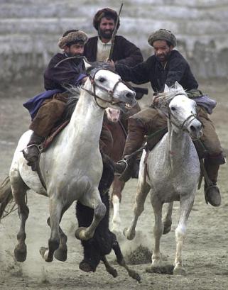 However, those who play buzkashi do not use mallets, nor do they use a ball; instead, they use a dead calf or goat whose head has been cut off. The players grab the dead headless calf or goat, pass it off to other players, and try to score by getting it in their goal. Serious buzkashi players train intensively for years, and many of the masters over forty years old.